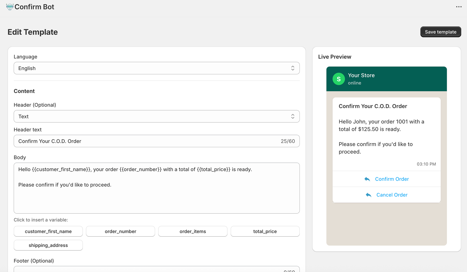 Confirm Bot automatically sends WhatsApp messages to confirm cash-on-delivery (COD) orders, tags them as confirmed or cancelled inside Shopify, and saves you hours of manual calls every day by reducing fake, unreachable, and low-intent COD orders.